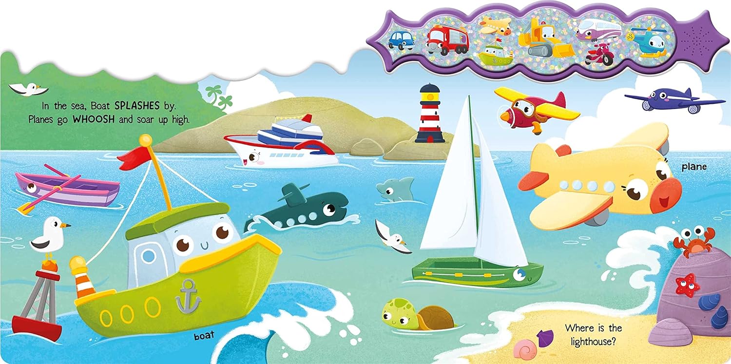 Press the buttons to hear all the vehicle sounds! Each press brings a different vehicle to life, captivating young readers with the authentic sounds they love. It's a sensory delight that enhances the reading experience.