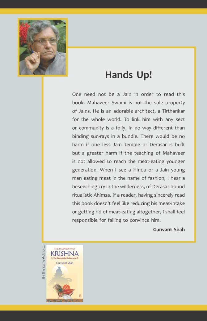 Hands Up! One need not be a Jain in order to read this book. Mahaveer Swami is not the sole property of Jains. He is an adorable architect, a Tirthankar for the whole world. To link him with any sect or community is a folly, in no way different than binding sun-rays in a bundle. There would be no harm if one less Jain Temple or Derasar is built but a greater harm if the teaching of Mahaveer is not allowed to reach the meat-eating younger generation. When I see a Hindu or a Jain young man eating meat in the name of fashion, I hear a beseeching cry in the wilderness, of Derasar-bound ritualistic Ahimsa. If a reader, having sincerely read this book doesn't feel like reducing his meat-intake or getting rid of meat-eating altogether, I shall feel responsible for failing to convince him.