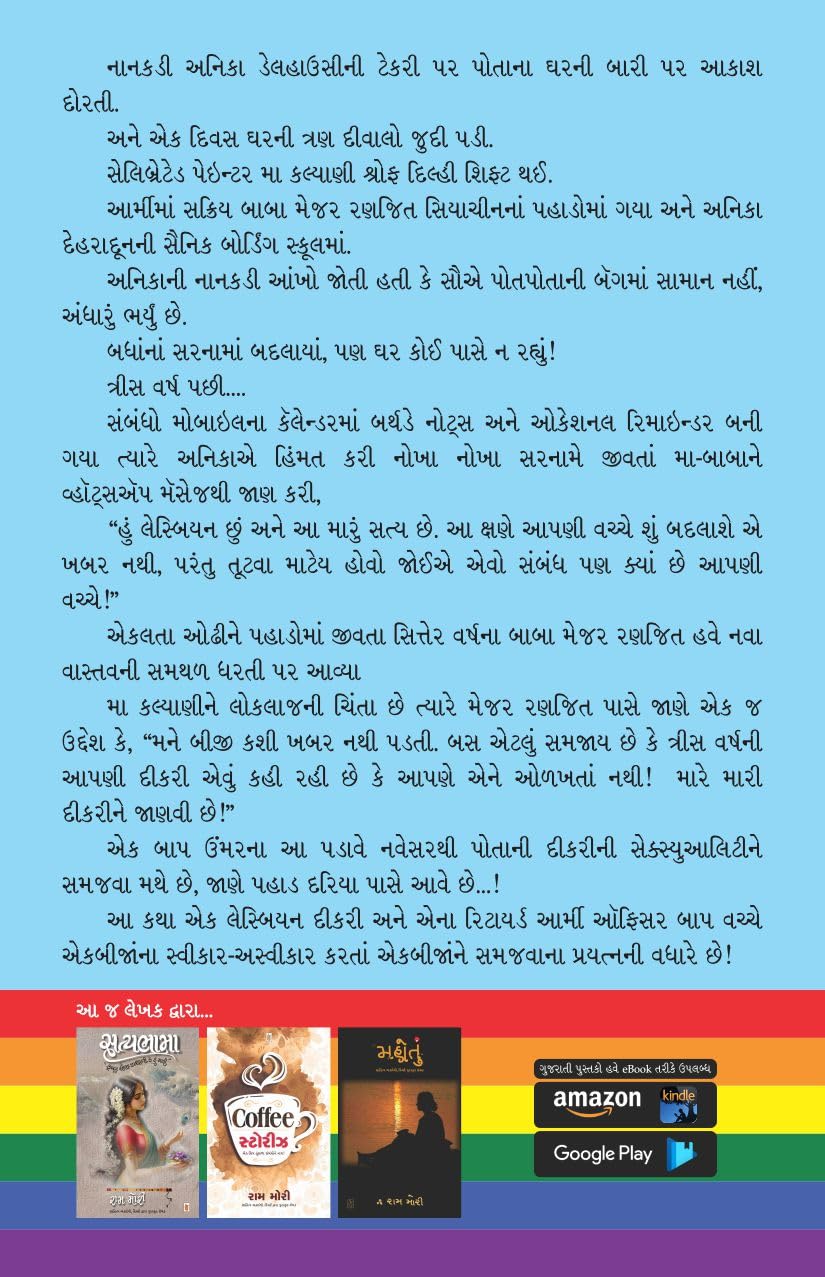 નાનકડી અનિકા ડેલહાઉસીની ટેકરી પર પોતાના ઘરની બારી પર આકાશ દોરતી. અને એક દિવસ ઘરની ત્રણ દીવાલો જુદી પડી. સેલિબ્રેટેડ પેઇન્ટર મા કલ્યાણી શ્રોફ દિલ્હી શિફ્ટ થઈ. આર્મીમાં સક્રિય બાબા મેજર રણજિત સિયાચીનનાં પહાડોમાં ગયા અને અનિકા દેહરાદૂનની સૈનિક બોર્ડિંગ સ્કૂલમાં. અનિકાની નાનકડી આંખો જોતી હતી કે સૌએ પોતપોતાની બૅગમાં સામાન નહીં, અંધારું ભર્યું છે. બધાંનાં સરનામાં બદલાયાં, પણ ઘર કોઈ પાસે ન રહ્યું! ત્રીસ વર્ષ પછી…. સંબંધો મોબાઇલના કૅલેન્ડરમાં બર્થડે નોટ્સ અને ઓકેશનલ રિમાઇન્ડર બની ગયા ત્યારે અનિકાએ હિંમત કરી નોખા નોખા સરનામે જીવતાં મા-બાબાને વ્હૉટ્સઍપ મૅસેજથી જાણ કરી, “હું લેસ્બિયન છું અને આ મારું સત્ય છે. આ ક્ષણે આપણી વચ્ચે શું બદલાશે એ ખબર નથી, પરંતુ તૂટવા માટેય હોવો જોઈએ એવો સંબંધ પણ ક્યાં છે આપણી વચ્ચે!” એકલતા ઓઢીને પહાડોમાં જીવતા સિત્તેર વર્ષના બાબા મેજર રણજિત હવે નવા વાસ્તવની સમથળ ધરતી પર આવ્યા મા કલ્યાણીને લોકલાજની ચિંતા છે ત્યારે મેજર રણજિત પાસે જાણે એક જ ઉદ્દેશ કે, “મને બીજી કશી ખબર નથી પડતી. બસ એટલું સમજાય છે કે ત્રીસ વર્ષની આપણી દીકરી એવું કહી રહી છે કે આપણે એને ઓળખતાં નથી! મારે મારી દીકરીને જાણવી છે!” એક બાપ ઉંમરના આ પડાવે નવેસરથી પોતાની દીકરીની સેક્સ્યુઆલિટીને સમજવા મથે છે, જાણે પહાડ દરિયા પાસે આવે છે…! આ કથા એક લેસ્બિયન દીકરી અને એના રિટાયર્ડ આર્મી ઑફિસર બાપ વચ્ચે એકબીજાંના સ્વીકાર-અસ્વીકાર કરતાં એકબીજાંને સમજવાના પ્રયત્નની વધારે છે!