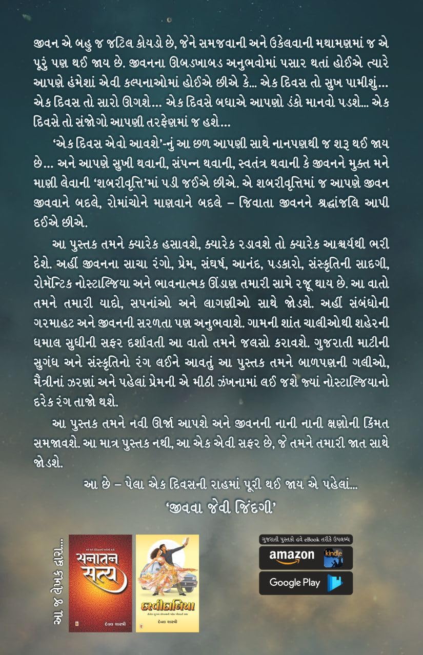 જીવન એ બહુ જ જટિલ કોયડો છે, જેને સમજવાની અને ઉકેલવાની મથામણમાં જ એ પૂરું પણ થઈ જાય છે. જીવનના ઊબડખાબડ અનુભવોમાં પસાર થતાં હોઈએ ત્યારે આપણે હંમેશાં એવી કલ્પનાઓમાં હોઈએ છીએ કે... એક દિવસ તો સુખ પામીશું… એક દિવસ તો સારો ઊગશે… એક દિવસે બધાએ આપણો ડંકો માનવો પડશે... એક દિવસે તો સંજોગો આપણી તરફેણમાં જ હશે… ‘એક દિવસ એવો આવશે’-નું આ છળ આપણી સાથે નાનપણથી જ શરૂ થઈ જાય છે… અને આપણે સુખી થવાની, સંપન્ન થવાની, સ્વતંત્ર થવાની કે જીવનને મુક્ત મને માણી લેવાની ‘શબરીવૃત્તિ’માં પડી જઈએ છીએ. એ શબરીવૃત્તિમાં જ આપણે જીવન જીવવાને બદલે, રોમાંચોને માણવાને બદલે – જિવાતા જીવનને શ્રદ્ધાંજલિ આપી દઈએ છીએ. આ પુસ્તક તમને ક્યારેક હસાવશે, ક્યારેક રડાવશે તો ક્યારેક આશ્ચર્યથી ભરી દેશે. અહીં જીવનના સાચા રંગો, પ્રેમ, સંઘર્ષ, આનંદ, પડકારો, સંસ્કૃતિની સાદગી, રોમૅન્ટિક નોસ્ટાલ્જિયા અને ભાવનાત્મક ઊંડાણ તમારી સામે રજૂ થાય છે. આ વાતો તમને તમારી યાદો, સપનાંઓ અને લાગણીઓ સાથે જોડશે. અહીં સંબંધોની ગરમાહટ અને જીવનની સરળતા પણ અનુભવાશે. ગામની શાંત ચાલીઓથી શહેરની ધમાલ સુધીની સફર દર્શાવતી આ વાતો તમને જલસો કરાવશે. ગુજરાતી માટીની સુગંધ અને સંસ્કૃતિનો રંગ લઈને આવતું આ પુસ્તક તમને બાળપણની ગલીઓ, મૈત્રીનાં ઝરણાં અને પહેલાં પ્રેમની એ મીઠી ઝંખનામાં લઈ જશે જ્યાં નોસ્ટાલ્જિયાનો દરેક રંગ તાજો થશે. આ પુસ્તક તમને નવી ઊર્જા આપશે અને જીવનની નાની નાની ક્ષણોની કિંમત સમજાવશે. આ માત્ર પુસ્તક નથી, આ એક એવી સફર છે, જે તમને તમારી જાત સાથે જોડશે. આ છે – પેલા એક દિવસની રાહમાં પૂરી થઈ જાય એ પહેલાં – ‘જીવવા જેવી જિંદગી’.