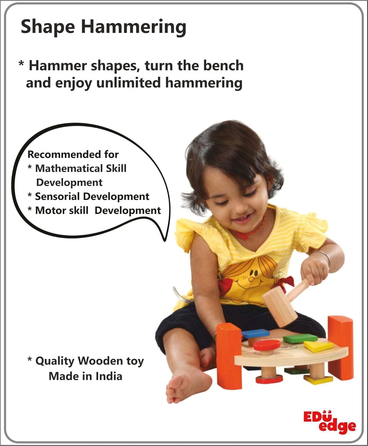 - Educational hammering shapes toy : Each box contains 1 wooden hammering bench with colourful shape knobs and a wooden hammer. Hit the knobs with hammer on one side, turn the bench and repeat.