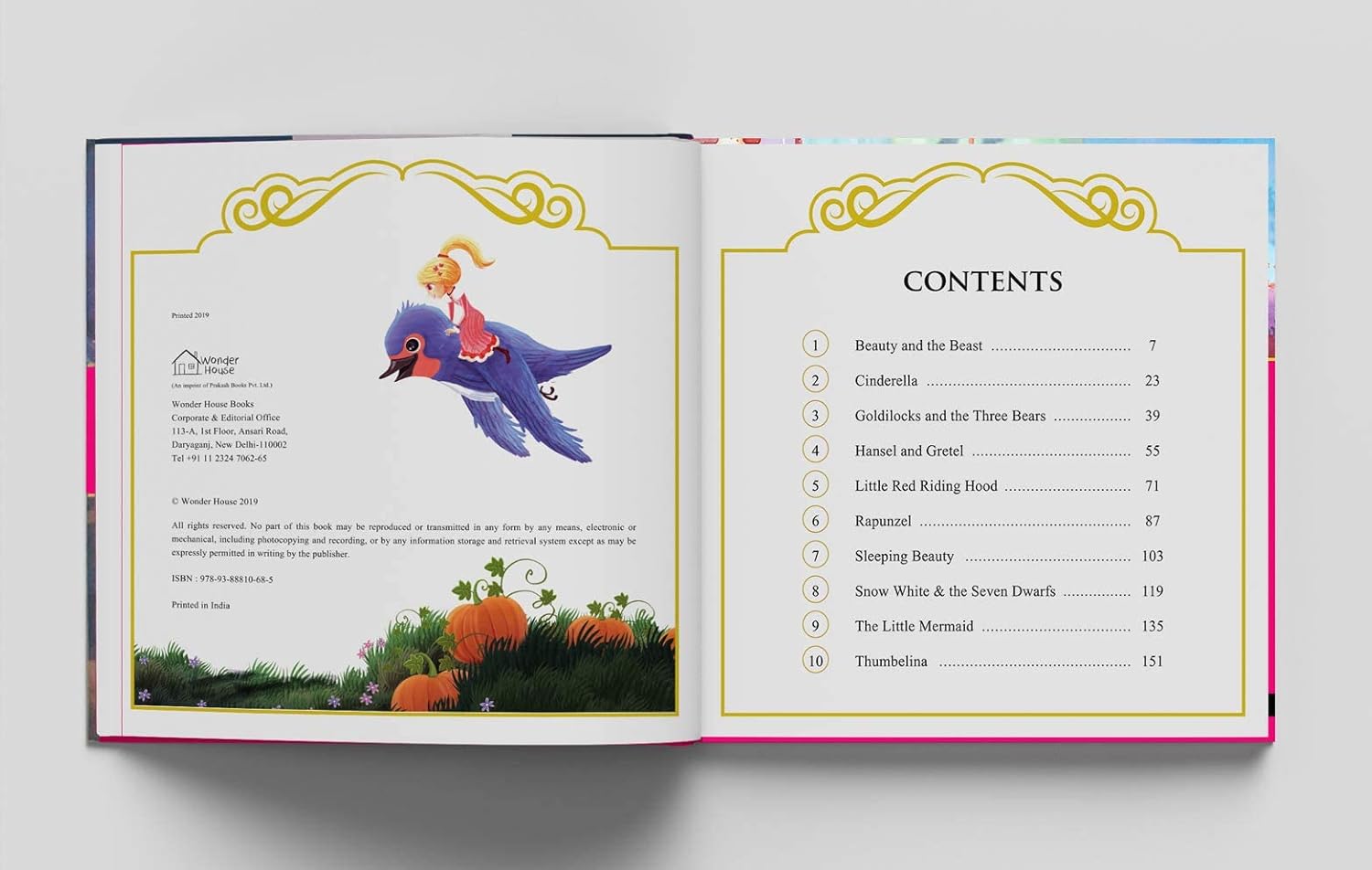 A collection of enchanting princess fairy tales to take your child on a journey with fairies, animals and magic. Written in simple English language, Each fairy tale has a beautiful end that makes it ideal for reading aloud to kids for story time and bedtime. The book is filled with vibrant and captivating illustrations, which will attract the attention of your child. The princess fairy tales book includes the following stories: beauty and the Beast sleeping beauty snow White and the seven dwarfs little Red Riding Hood Cinderella Goldilocks and the three bears Rapunzel Thumbelina Hansel and Gretel, and the little mermaid.